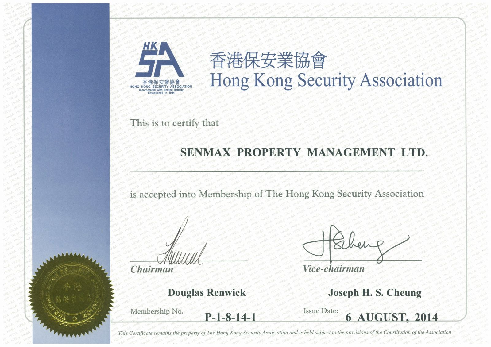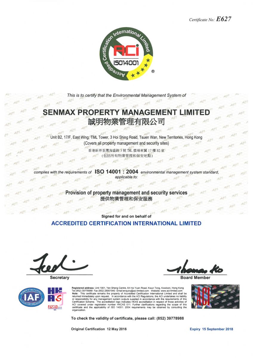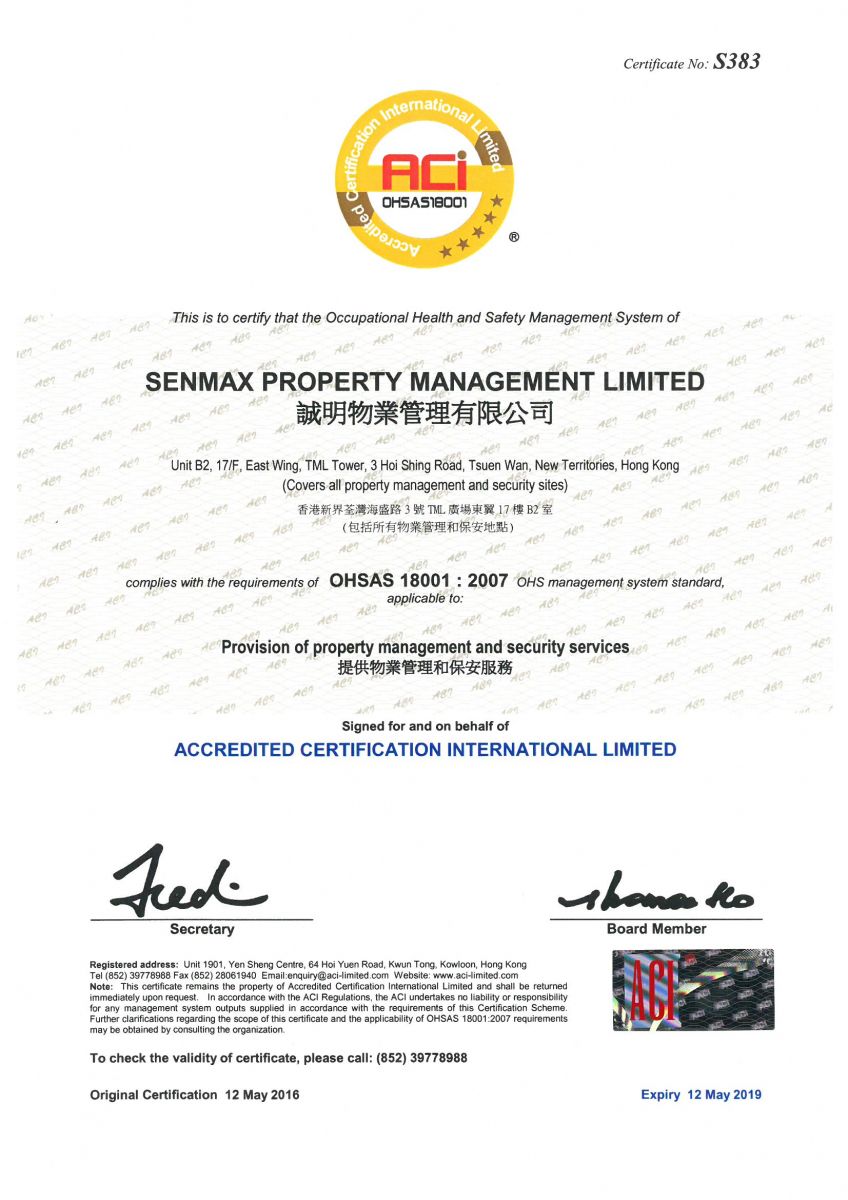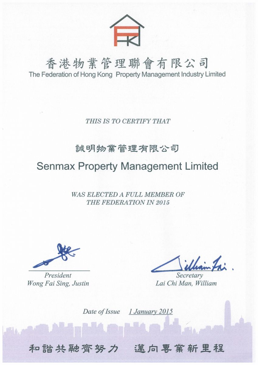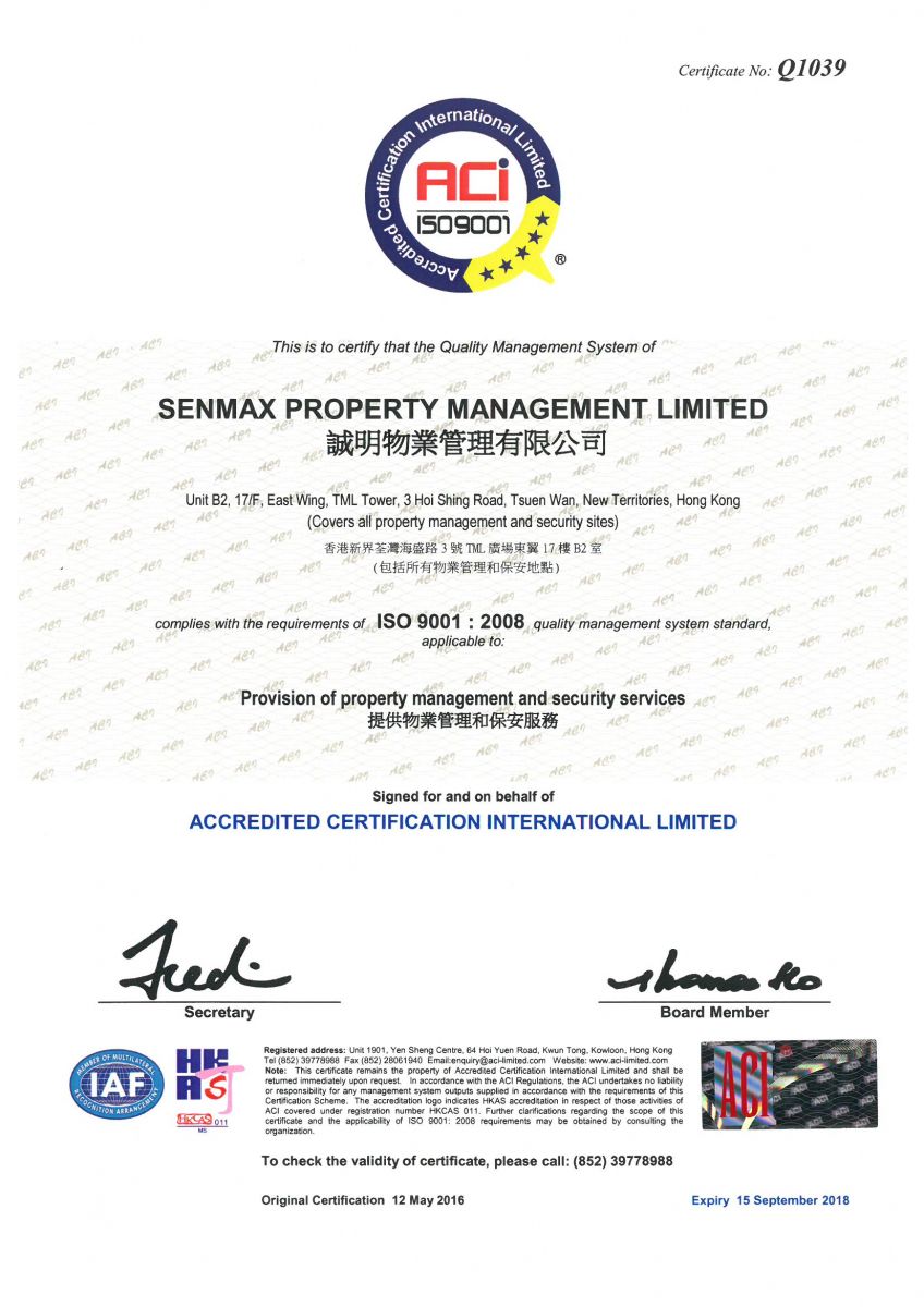 In order to ensure the quality of our services, we have security license, ISO 9001, ISO 14001, OHSAS 18001 Management System etc. In year 2014, we also joined in The Hong Kong Association of Property Management Companies Limited, The Federation of Hong Kong Property Management Industry Limited and Hong Kong Security Association as a Company Member.